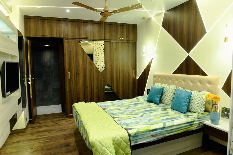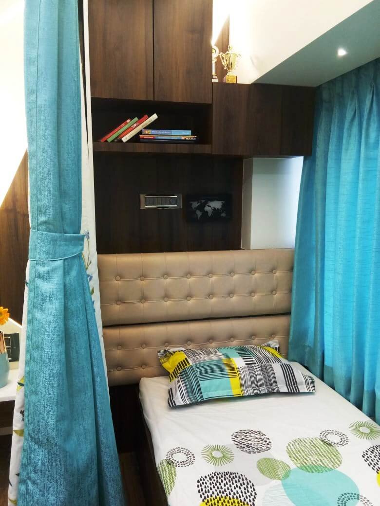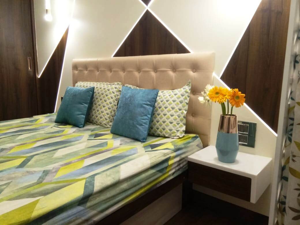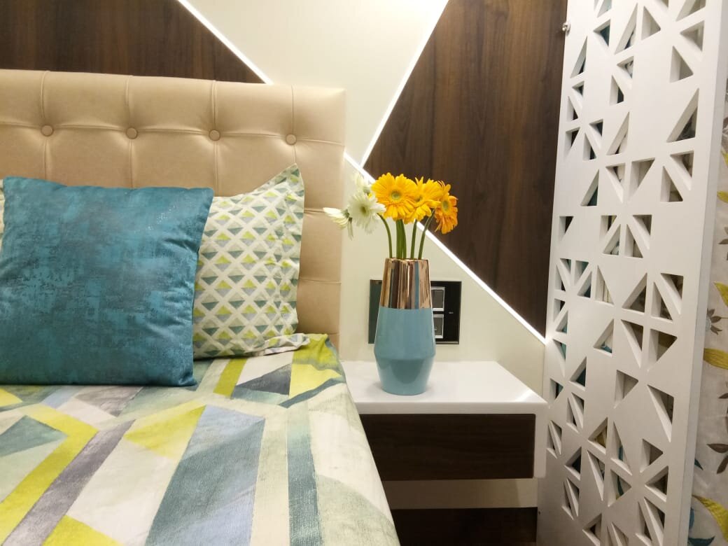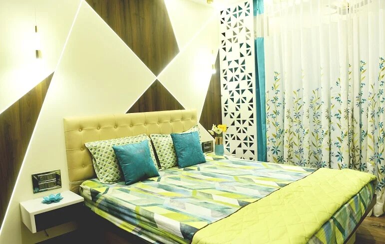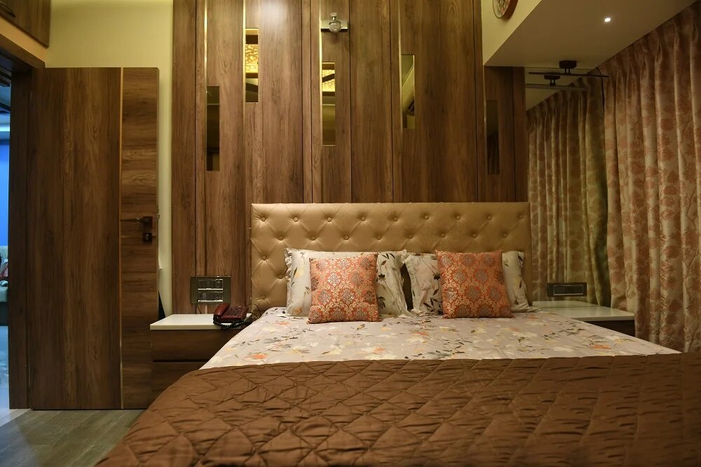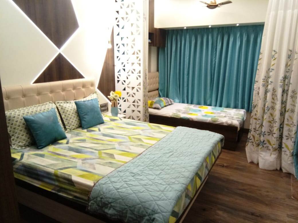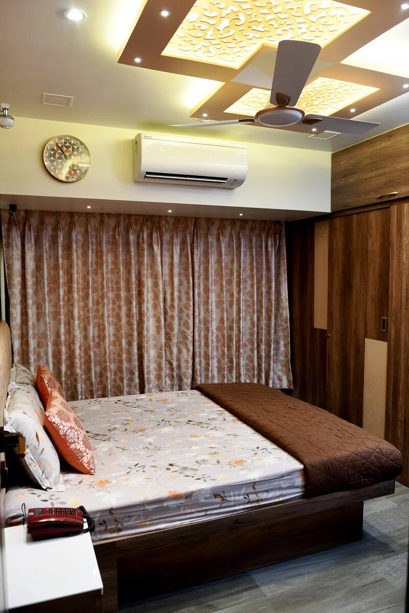 For master bedroom client wanted to give seperate space for their small child but didn't wanted to divide bedroom with partitions they just wanted a curtains in between which can close whenever they want and slide back so we had given white Jali screens at one end of curtains as when curtains are open that can fit inbetween that screens. LED profile lights in the form of lines used at master bedroom to give special effects of warm lighting. We kept parents bedroom in a soft peach color scheme. Rhythm of lines continues from wall to ceiling in both that bedrooms.