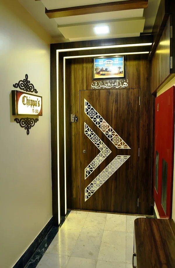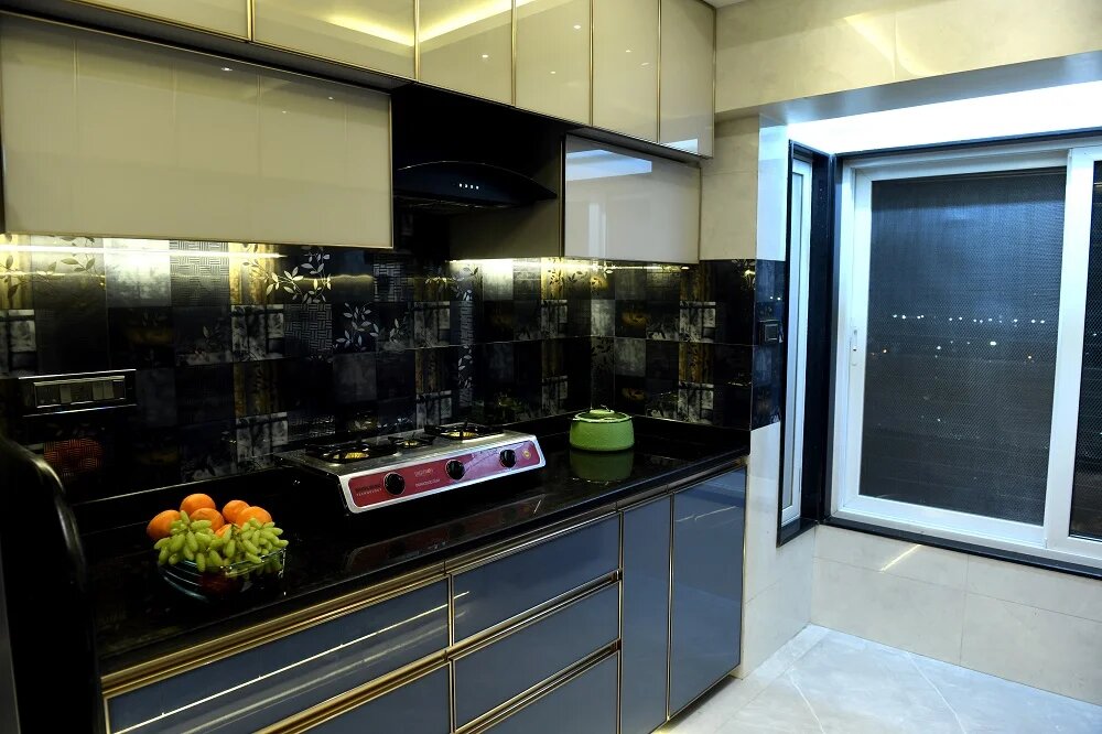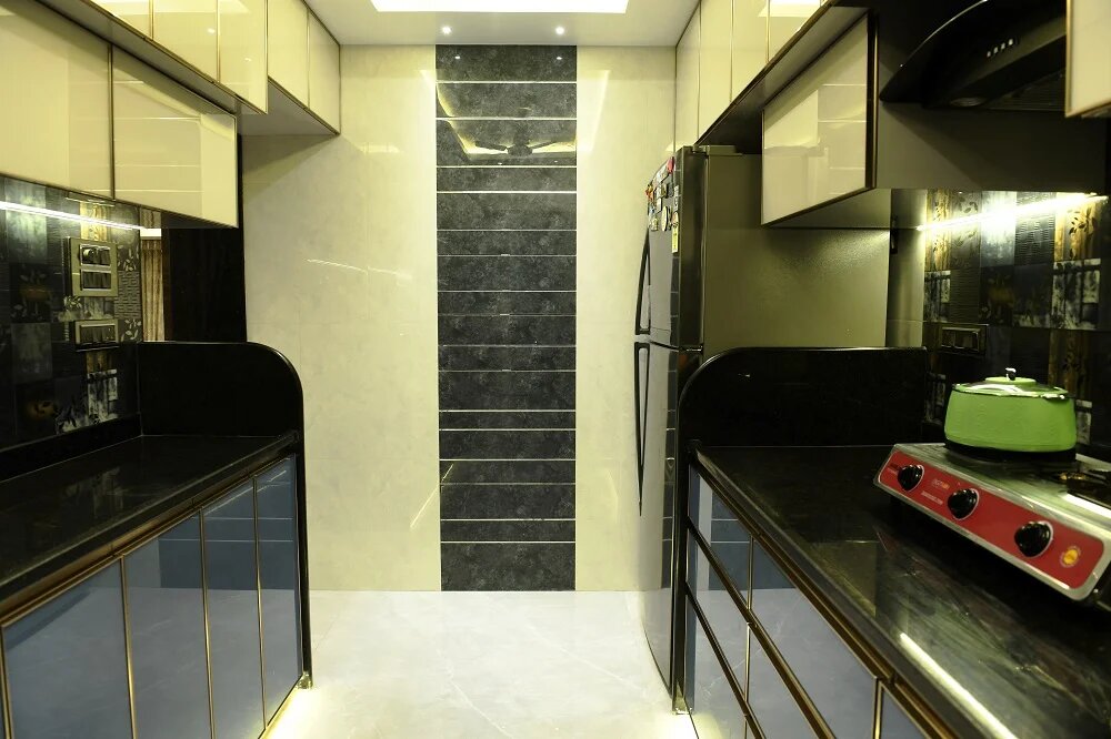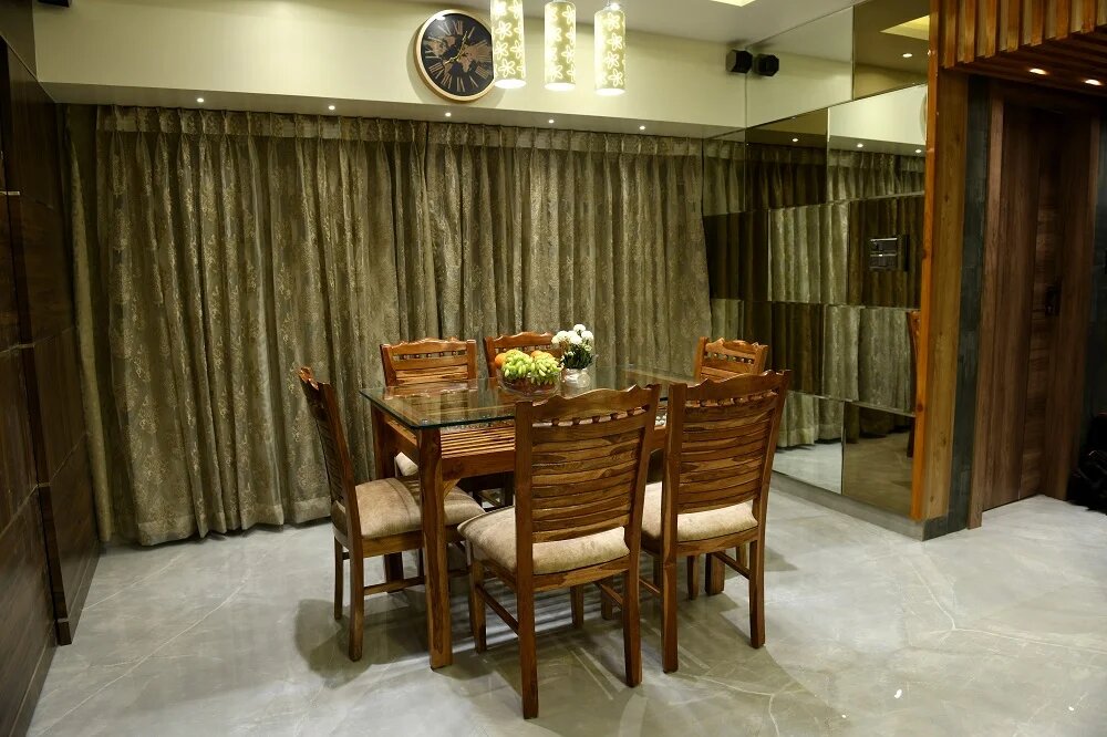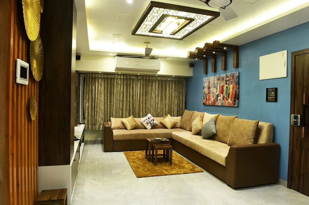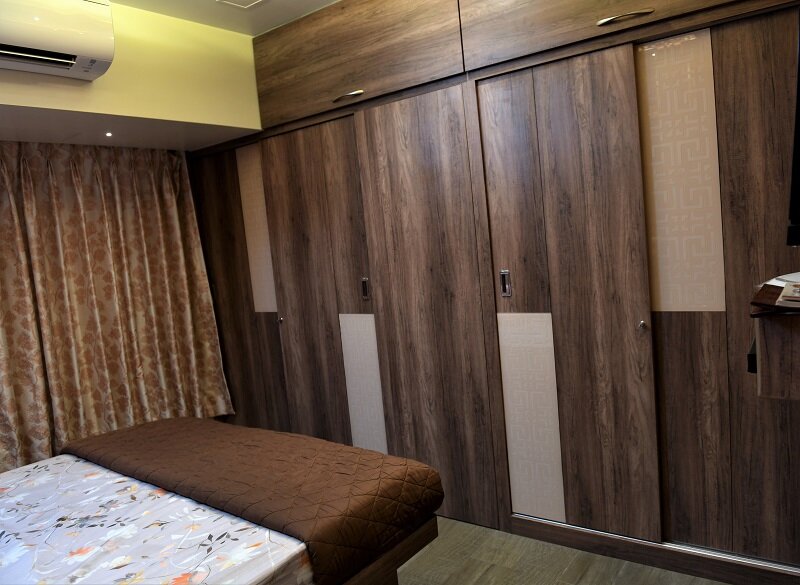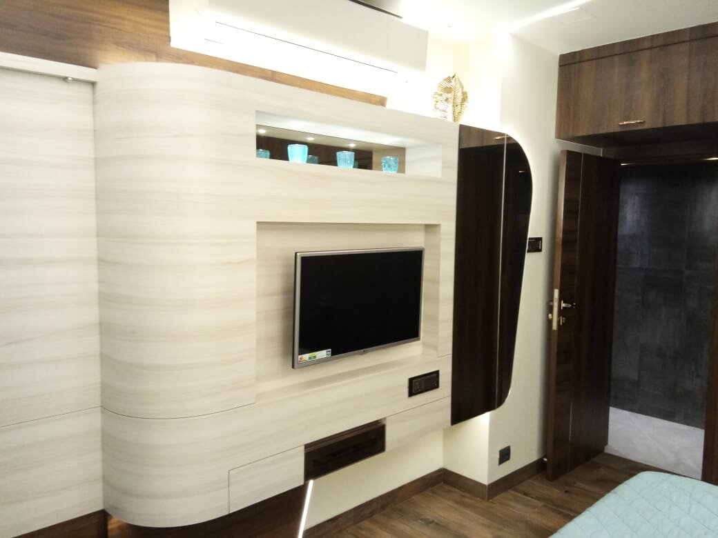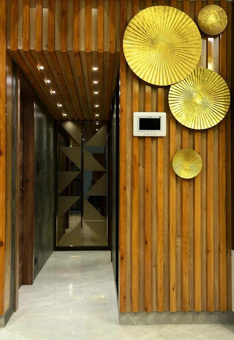As requirement of the project was to design extra space in to 2 bhk planning apartment for a common toilet as both bedrooms had attached toilets ,so client wanted one common bathroom near the living room area. While designing we derived concept of "Rhythm of lines" for the apartment. The first impression of the flat was when we enter from the main door the first thing comes in scene was a passage area so designed that area to give appealing look, we classes that wall with vertical battens which continued in to passage ceiling with small spot lights in between. As client major requirement was lot of storage spaces in the house we created storage unit at passage area too and designed it's shutters with bronze mirrors in such a way that one could not recognize that there is a big storage unit as its looking like decorative mirror only.